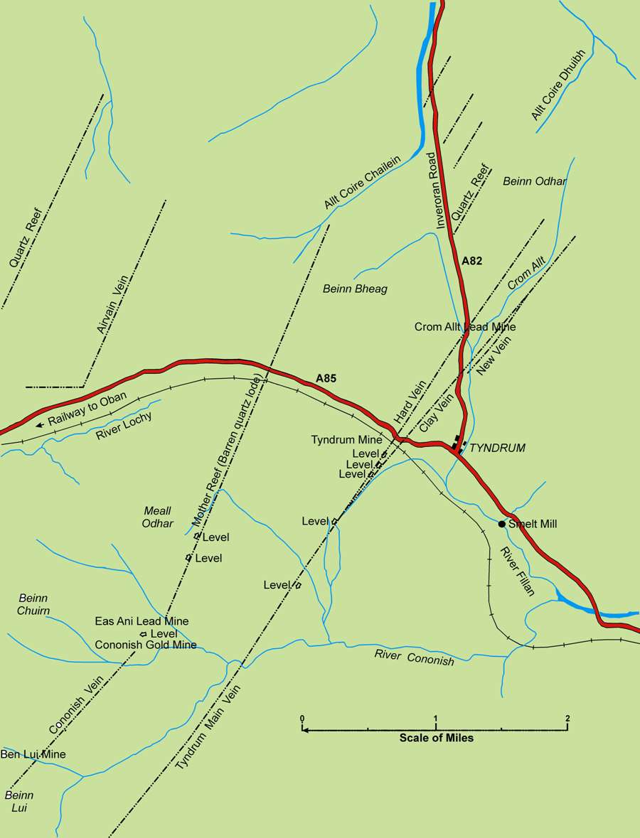 Lead and zinc mines were developed near this small Perthshire village, at the junction of the A82 and A85 roads in Strath Fillan. The area consists of metamorphic rocks crossed by a vein running to the north east. On the west side of the fault are quartsites and quartzose-flags, while on its east side are silvery-grey, soft, micaceous-schists.