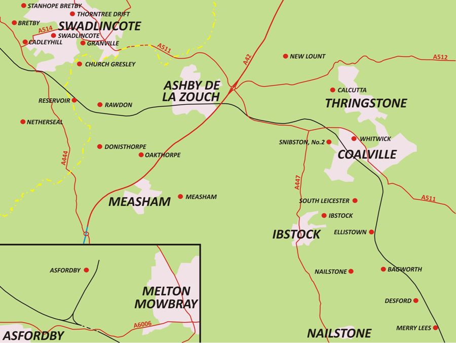 The main coalfield lies in a ten mile square area centred on Ashby-de-la-Zouch, extending across the county boundary. There were probably small pits on Swannington Common before the Norman Conquest, as the coal was regarded as a common asset of the free men of the village. Documentary references begin in the 13th century at Swannington and Worthington. There were mines at Staunton Harold in the early 14th century, and by the 1420s the nearby village of Overton Saucy was sufficiently well-known as a supplier of coal to be renamed “Coal Overton”, later shortened to “Coleorton”.